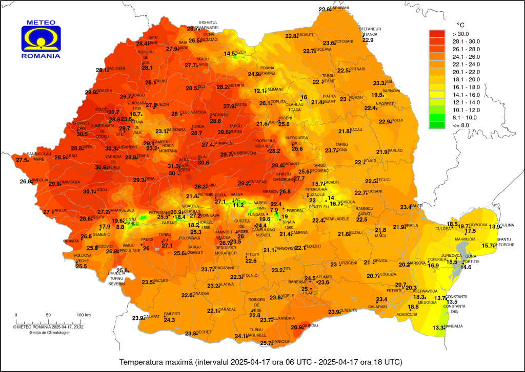 În locuri unde astfel de temperaturi apăreau rar în aprilie s-a făcut joi, 17 aprilie, extrem de cald. Valorile cele mai ridicate nu au fost în Oltenia sau Muntenia, ci în Transilvania și Banat. Cel mai cald a fost la Alba Iulia (+31,3 C), ceea ce înseamnă 15 grade Celsius peste normalul perioadei.