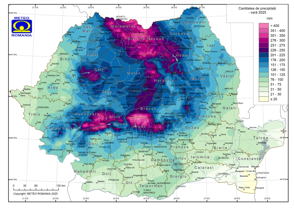 Cea mai ridicată cantitate totală de precipitații (mm), înregistrată la stațiile meteorologice din rețeaua Administrației Naționale de Meteorologie a fost de 443,6 mm, la stația meteorologică Bâlea-Lac.