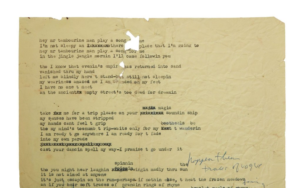 Schițele dactilografiate ale lui Bob Dylan pentru celebrul cântec Mr. Tambourine Man din 1965 au fost vândute la licitație, sâmbătă, cu peste 400.000 de lire sterline (peste 500.000 de dolari), scrie The Guardian.
