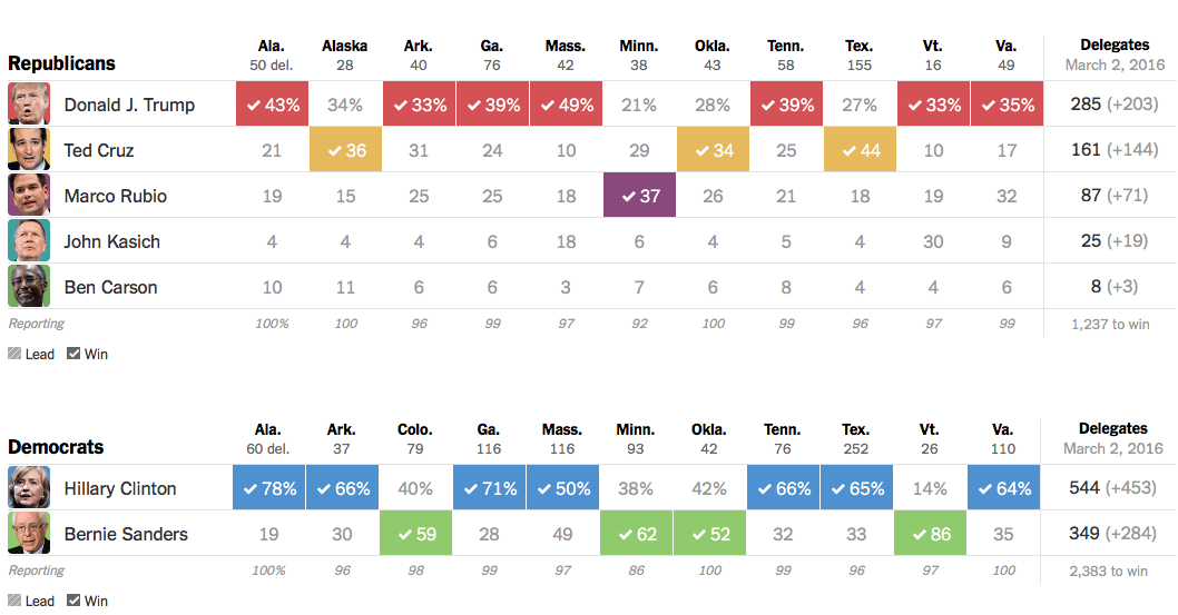 Dar Donald Trump conduce in cursa pentru nominalizarea republicana dupa ce a castigat in Alabama, Arkansas, Georgia, Massachusetts, Tennessee, Vermont si Virginia, in plus fata de cele trei state unde a obtinut deja victoria inaintea acestei zile a alegerilor.
