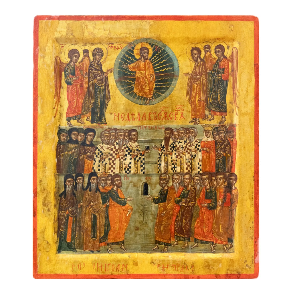 Alături de aceasta, licitația aduce în prim-plan o altă piesă de importanță muzeală: icoana „Duminica Tuturor Sfinților”, care provine dintr-o prestigioasă colecție și are un preț de pornire de 5.000 de Euro. Iată liniile importante ale parcursului său istoric: până în 1964, icoana s-a aflat în colecția reputatului medic și colecționar dr. Ioan Dumitrescu-Popovici, pentru ca ulterior să fie sechestrată de autoritățile comuniste și integrată, pentru mai bine de patru decenii, în patrimoniul Muzeului Național de Artă al României. Abia în 2025, lucrarea a fost retrocedată moștenitorilor familiei, reintrând astfel în circuitul privat.