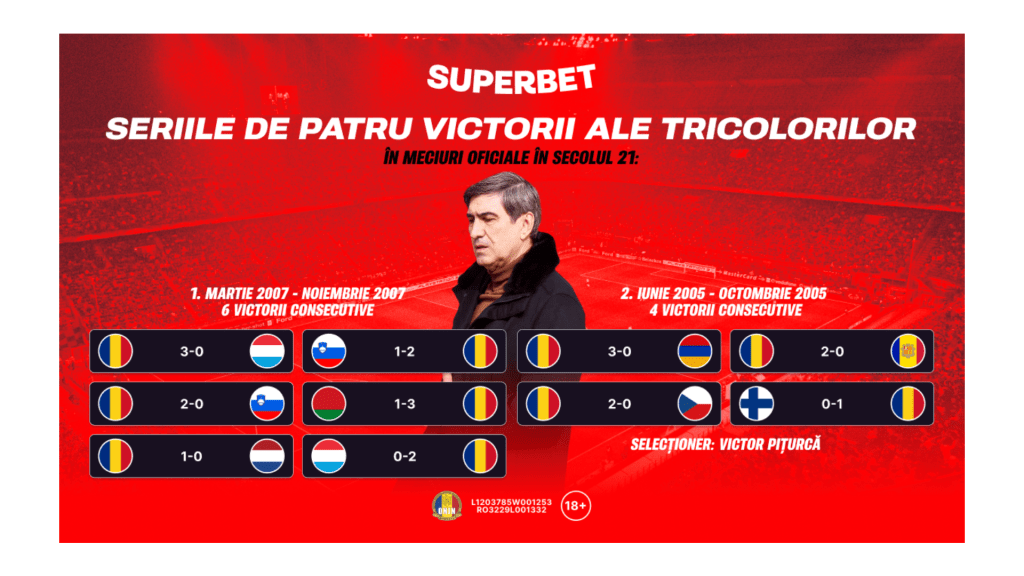 Ultima dată când România a reușit această performanță îl avea pe banca tehnică pe Victor Pițurcă, iar vedetele din teren se numeau Adrian Mutu și Cristian Chivu. Se întâmpla între martie și noiembrie 2007, în preliminariile pentru Europeanul din Elveția și Austria, când, rând pe rând, Luxemburg (3-0 și 2-0), Slovenia (2-1 și 2-0), Belarus (3-1) și Olanda (1-0) se recunoșteau învinse și România semna un șir de șase succese la rând.