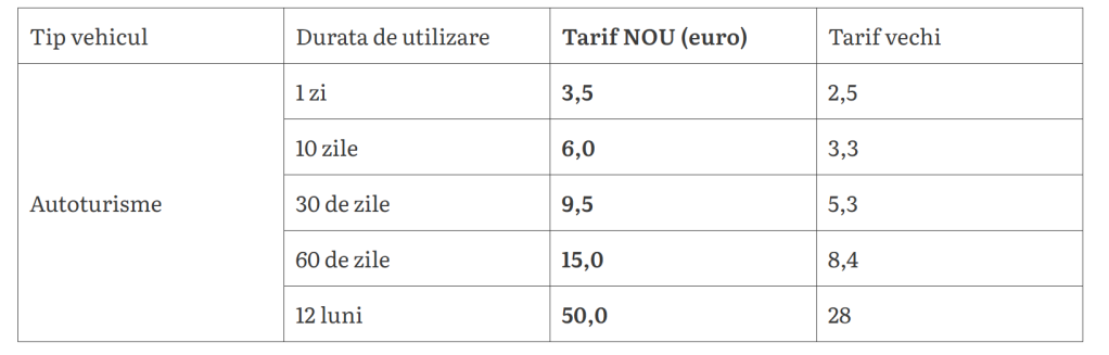 Tariful anual al rovinietei pentru autoturisme a crescut de la 28 de euro la 50 de euro (TVA inclus), în timp ce o rovinietă de zi costă 3,5 euro, față 2,5 euro până ieri.