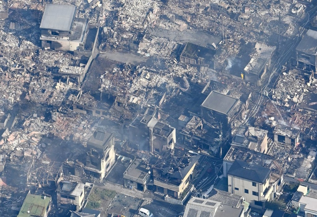 Imaginile aeriene difuzate de posturile de televiziune au arătat case transformate în ruine şi coloane groase de fum ridicându-se din cartierul Saganoseki al oraşului Oita, situat pe un deal, unde un incendiu a izbucnit marți seară, potrivit Reuters și AP, citate de News.ro.