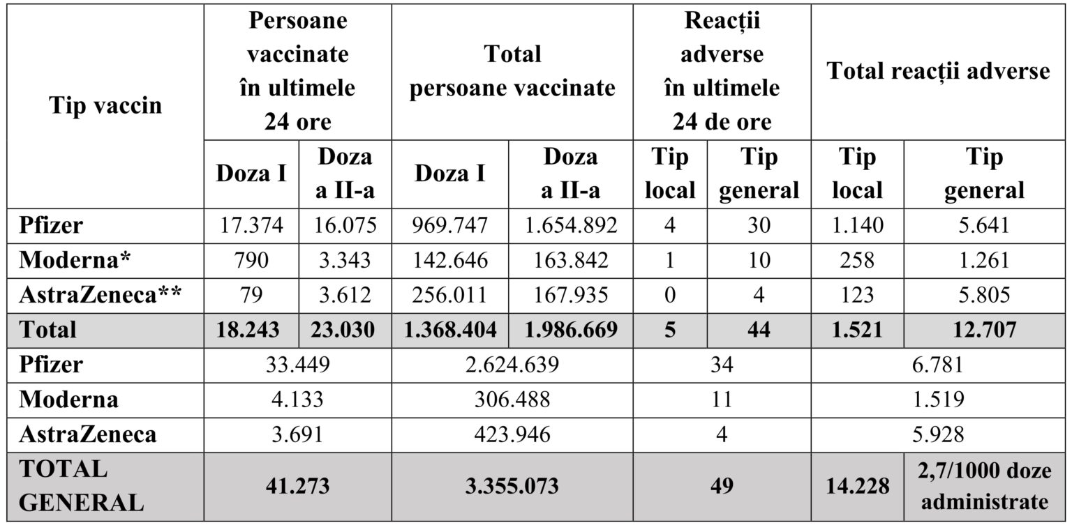 Număr total de reacții adverse înregistrate la nivelul centrelor de vaccinare (în ultimele 24 de ore): 49 reacții comune și minore, din care: 5 reacții de tip local și 44 reacții generale.