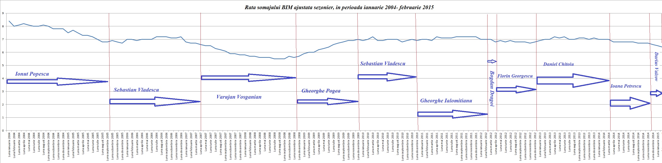 In februarie 2015 rata somajului a fost de 6,4%. mai mica cu 0,1 puncte procentuale fata de luna precedenta si cu 0,6 puncte procentuale fata de nivelul inregistrat in luna februarie 2014, a transmis marti Statistica. Numarul somerilor (in varsta de 15-74 ani), estimat pentru luna februarie din anul curent este de 597.000 persoane, in scadere atat fata de luna precedenta (607.000 persoane), cat si fata de aceeasi luna din anul anterior (644.000 persoane), mai arata calculele INS. Vezi mai jos rata somajului sub ministrii Finantelor din perioada ianuarie 2004-februarie 2015.