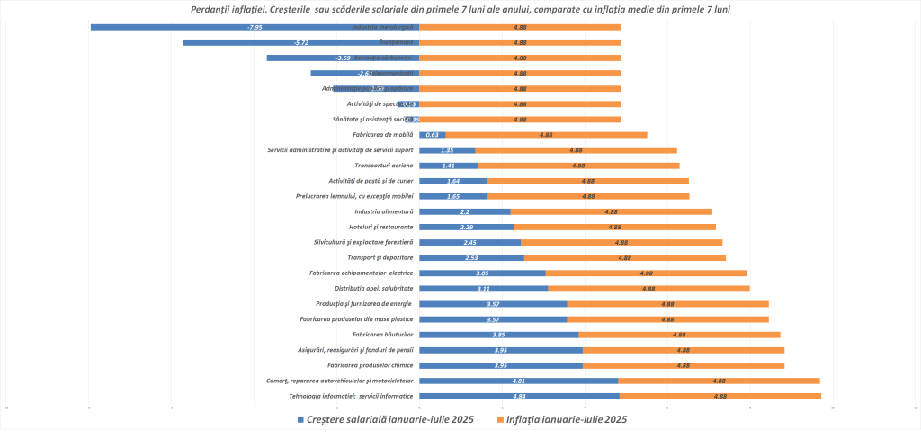 HotNews a calculat în ce domenii creșterea salarială din perioada ianuarie-iulie 2025 a fost depășită de inflația din intervalul ianuarie-iulie 2025. Pentru a calcula inflația din acest interval, am folosit calculatorul pus la dispoziție de INS.