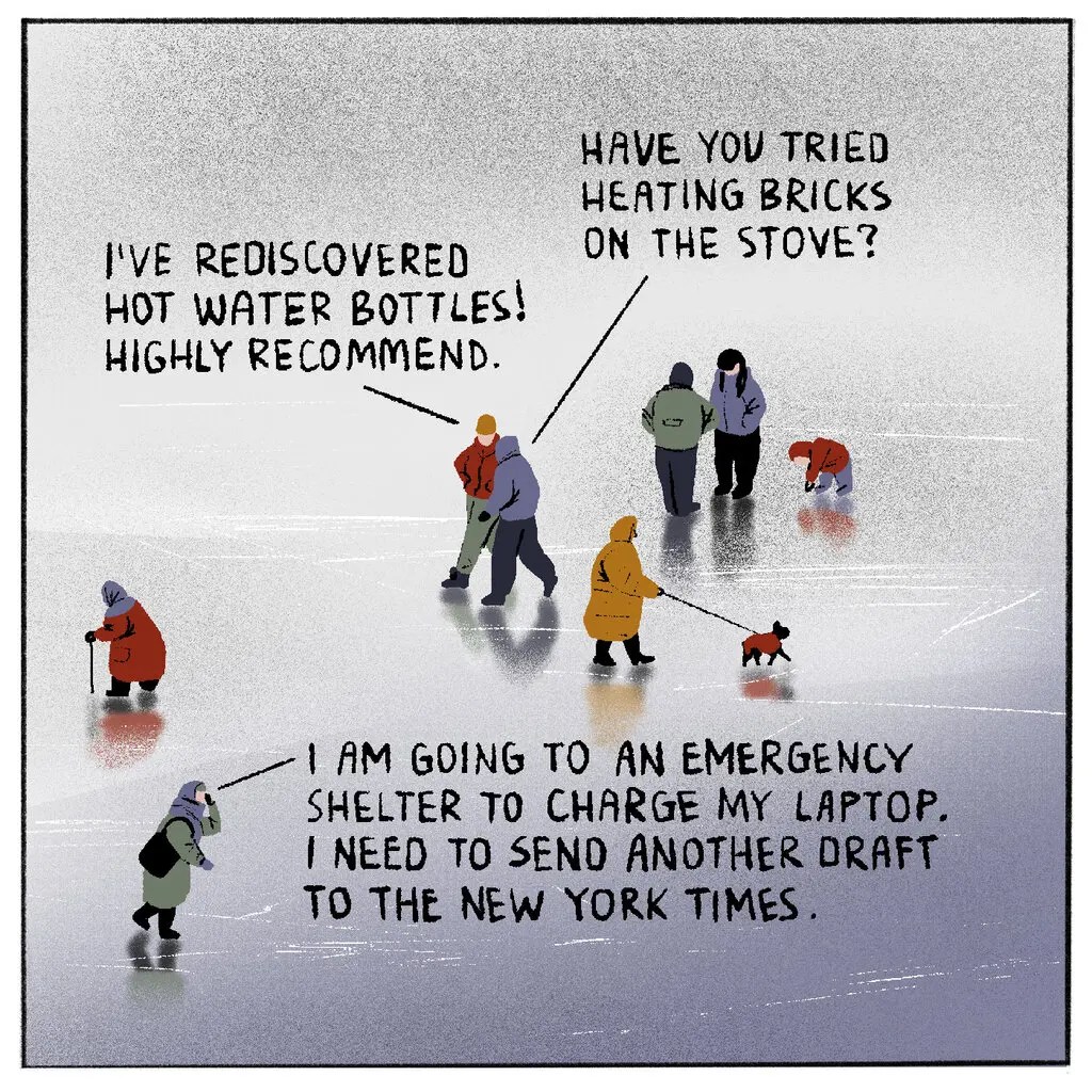 „Când întâlnești oameni pe stradă, conversațiile banale sunt doar despre cum reușim să ne încălzim. Poate chiar conversația în sine este o modalitate de a ne încălzi”, scrie în textul narativ al imaginii.