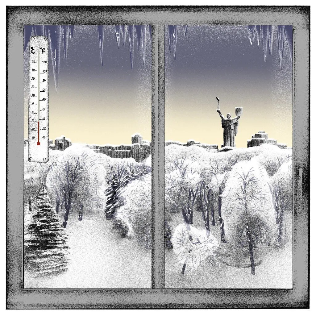 O imagine surprinde un peisaj de la fereastră asupra capitalei Kiev, în toiul gerului pe care oamenii l-au îndurat iarna asta: monumentul Patria Mamă, blocuri înghețate și copaci acoperiți de zăpadă.