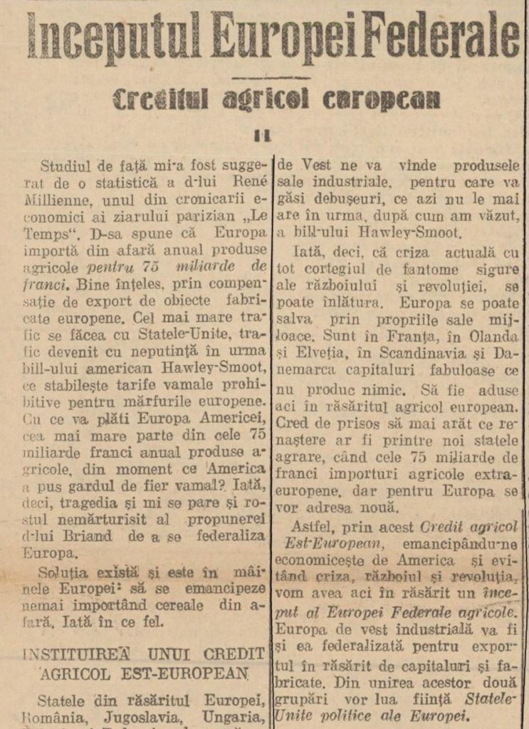 Foarte interesant e un text de primă pagină publicat în august 1930 în Neamul Românesc, ziarul lui Nicolae Iorga. Articolul, intitulat „Începutul Europei Federale”, pornește de la ideea că, de vreme ce „America a pus gardul de fier vamal”, Europa trebuie să-și refacă socotelile, să-și analizeze resursele și să construiască punți între Est și Vest. Autorul, N. N. Lenguceanu, avea credința că acesta este „rostul nemărturisit al propunerei d-lui [Aristide] Briand de a se federaliza Europa” (referire la ministrul francez de Externe, care în 1929 prezentase la Liga Națiunilor o propunere de federalizare a Europei).