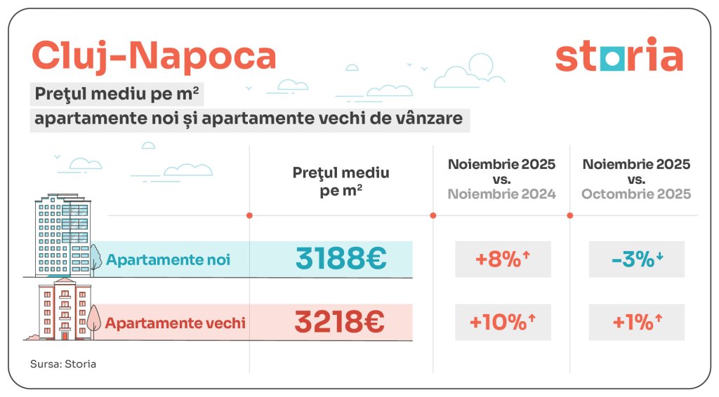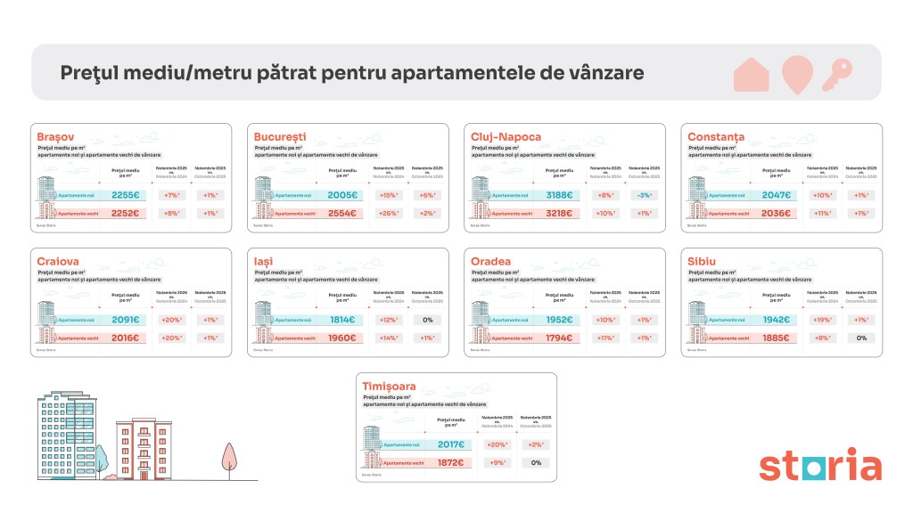 Prețurile apartamentelor din marile orașe, cumulate pentru locuințele noi și vechi, au crescut în medie cu 15% comparativ cu anul trecut, conform prețurilor medii din anunțurile publicate pe Storia – cea mai vizitată platformă imobiliară din România. Cluj-Napoca rămâne cel mai scump oraș din țară, cu un preț mediu de 3.204 euro pe metru pătrat, urmat de București (2.264 euro/mp) și Brașov (2.253 euro/mp). La polul opus, cele mai accesibile orașe sunt Iași (1.735 euro/mp) și Oradea (1.828 euro/mp), în timp ce Constanța se remarcă drept singurul oraș unde prețurile cumulate au scăzut semnificativ, cu 22% față de anul trecut.