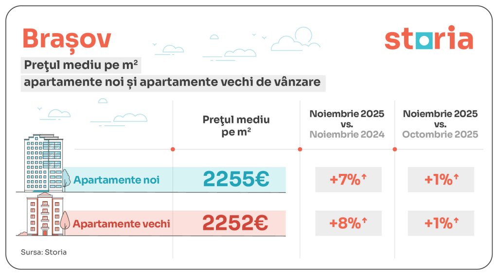 În Brașov, prețul mediu solicitat a fost de 2.255 euro/mp pentru apartamentele noi, cu 7% mai mult decât anul trecut și 1% peste nivelul din octombrie. În cazul apartamentelor vechi, prețurile au fost de 2.252 euro/mp, în creștere cu 8% față de anul trecut și 1% față de luna anterioară. Diferențele sunt minime între cele două categorii, de doar 3 euro.