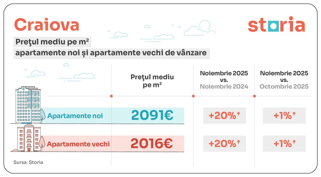 În Craiova, apartamentele noi au un preț mediu de 2.091 euro/mp, cu 20% mai mult decât anul trecut și 1% peste nivelul din octombrie, iar cele vechi 2.016 euro/mp, în creștere cu 20% față de anul trecut și 1% față de luna anterioară.
