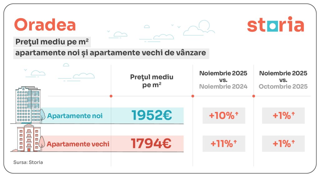 În Oradea, apartamentele noi au un preț mediu de 1.952 euro/mp, cu 10% mai mult decât anul trecut și 1% peste nivelul din octombrie, iar cele vechi 1.794 euro/mp, în creștere cu 11% față de anul trecut și 1% față de luna anterioară.