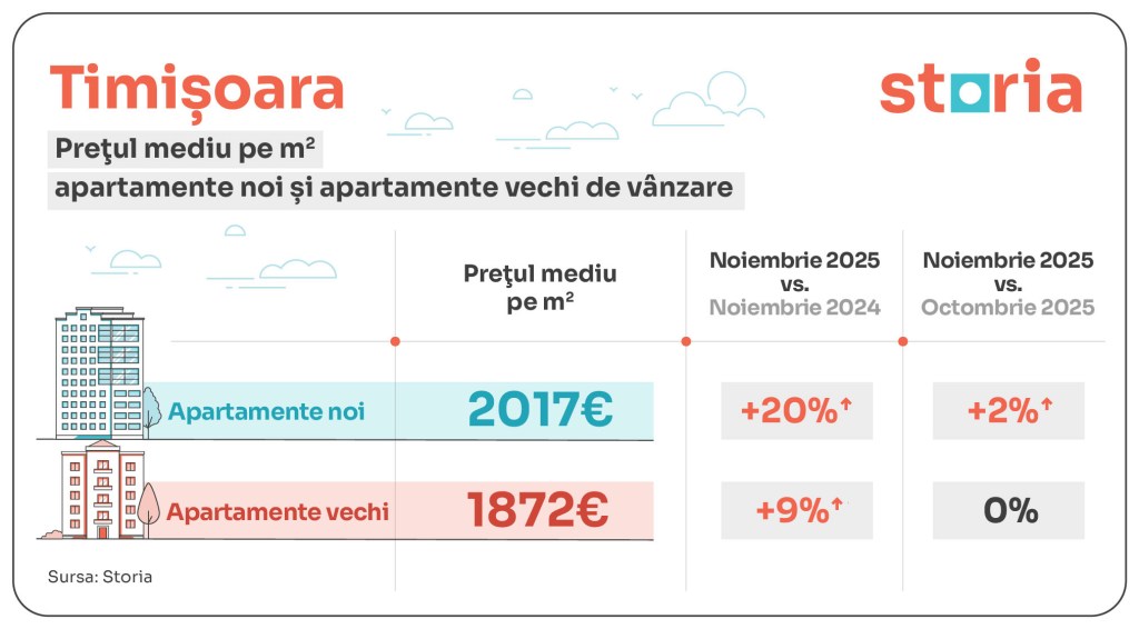 În Timișoara, apartamentele noi au un preț mediu de 2.017 euro/mp, cu 20% mai mult decât anul trecut și 2% peste nivelul din octombrie, iar cele vechi 1.872 euro/mp, în creștere cu 9% față de anul trecut și similar cu luna anterioară.