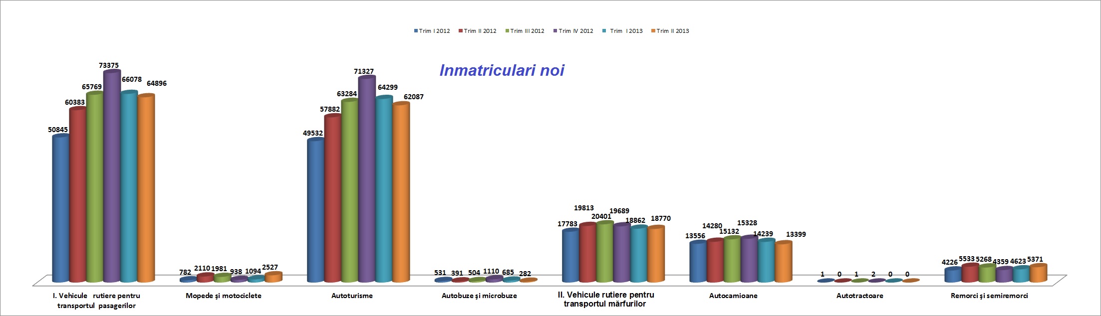 In semestrul I 2013, fata de semestrul I 2012, inmatricularile noi de vehicule rutiere pentru transportul pasagerilor au crescut cu 17,8% iar cele pentru transportul marfurilor cu 0,1%. In trimestrul II 2013, inmatricularile noi de mopede si motociclete au crescut cu 19,8%, iar cele de autoturisme cu 7,3%, fata de trimestrul II 2012. In ceea ce priveste autobuzele si microbuzele, inmatricularile noi au scazut cu 27,9%. Inmatricularile noi de vehicule rutiere pentru transportul marfurilor au scazut la toate categoriile, respectiv cu 6,2% la categoria autocamioane si cu 2,9% la remorci si semiremorci, potrivit Institutului National de Statistica.