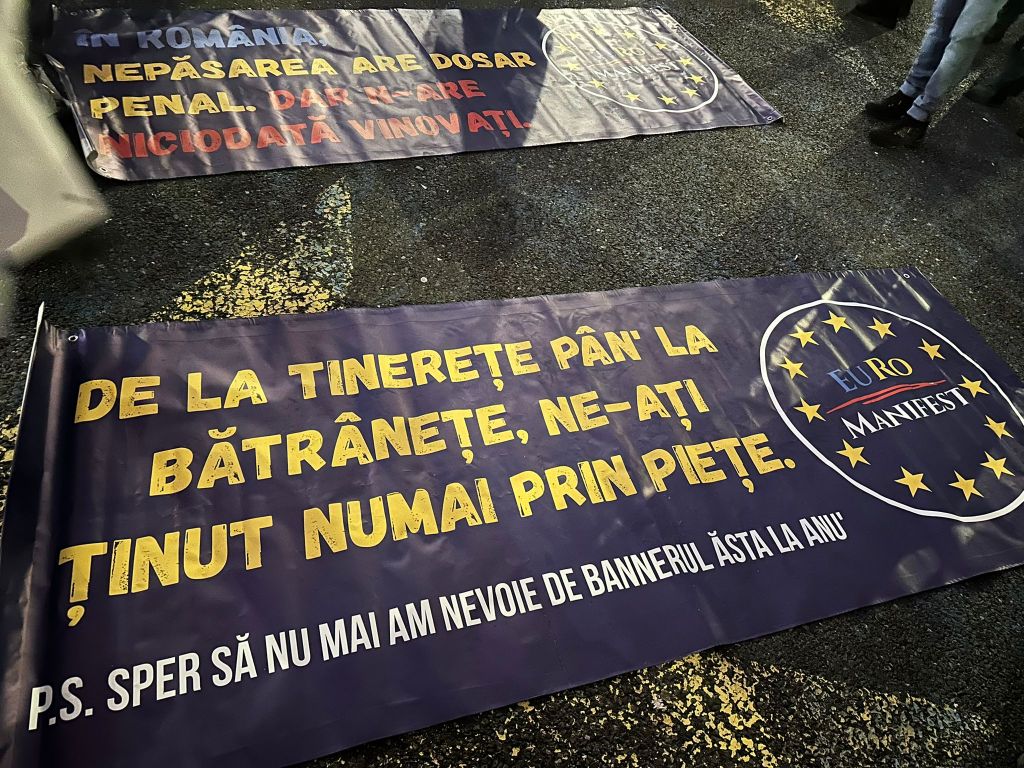 Manifestanții au venit cu bannere, pancarte și steagurile României și UE.