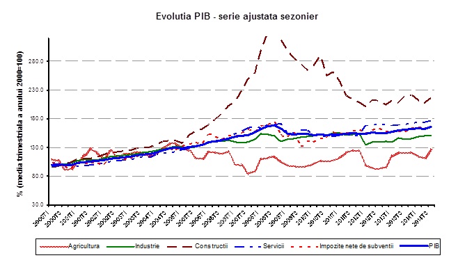Statistica a confirmat vineri cresterea economica din 2014 anuntata in 13 februarie, mai exact Produsul Intern Brut urcand (in 2014 fata de 2013) cu 2,9%, pana la 669,5 miliarde de lei preturi curente. Asta inseamna o medie de PIB/locuitor de 33.989,66 lei (7655,3 euro/locuitor, la cursul mediu BNR din 2014). Daca ne uitam la contributiile diferitelor sectoare economice la cresterea din 2014, remarcam industria (+0,9%, cu o pondere de 24,0% la formarea PIB) si informatiile si comunicatiile (+0,6%, cu o pondere de 6,0% la formarea PIB). Consemnam si reducerea volumului de activitate din intermedieri financiare si asigurari, cu 2,7%, cu un impact negativ asupra evolutiei PIB de -0,1%. Ce ne mai spune comunicatul de vineri al INS?