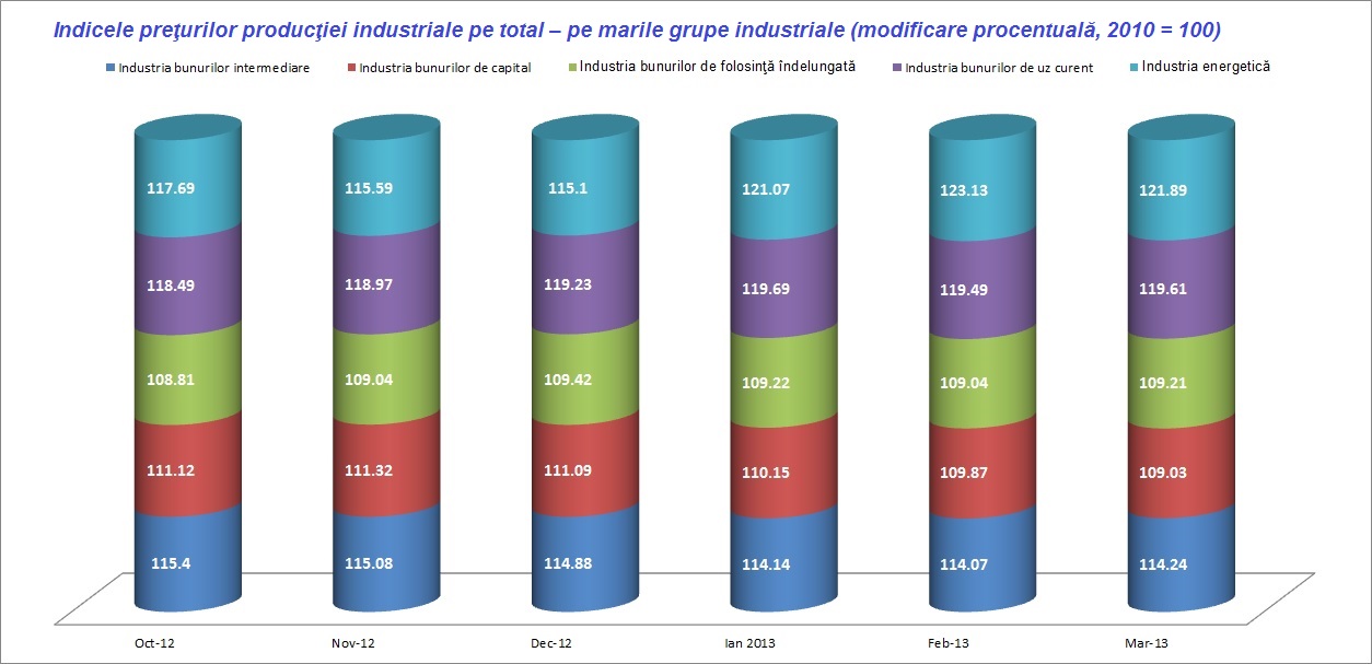 In martie 2013, comparativ cu aceeasi luna din anul precedent, preturile productiei industriale au crescut semnificativ la bunurile de uz curent si la produsele energetice, cu 7,8% si respectiv cu 6,1%.