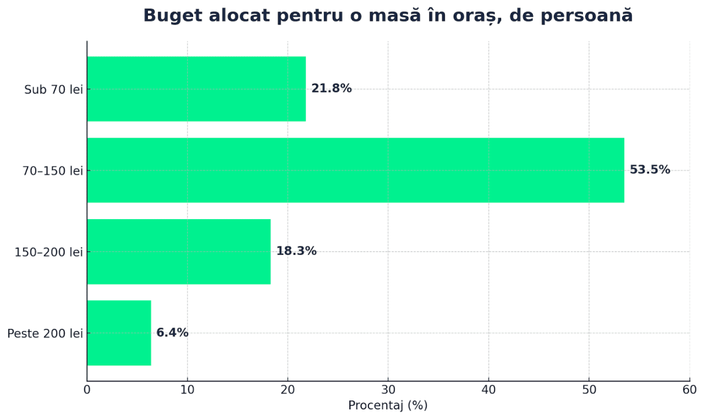 Valoarea medie cheltuită de persoană pentru o masă se situează în intervalul 70–150 lei pentru mai bine de jumătate respondenți (54%), iar 22% spun că alocă sub70 de lei pentru această cheltuială.