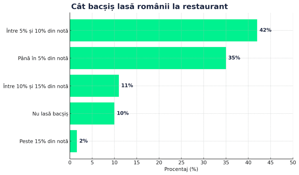 Deși frecvența ieșirilor în oraș a scăzut, obiceiul de a lăsa bacșiș rămâne adânc înrădăcinat. 42% dintre români lasă între 5% și 10% din nota de plată, iar 35% se opresc la maxim 5%. Doar 11% oferă peste procentul standard de 10%, iar unul din 10 români declară că nu lasă deloc bacșiș.