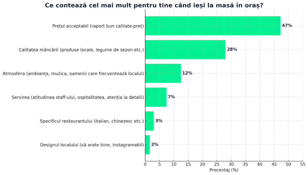 În 2025,raportul calitate-preț cântărește cel mai mult în selectarea unui local: aproape jumătate dintre români (47%) spun că asta contează cel mai mult pentru ei în decizia de a lua masa la un restaurant. Calitatea mâncării este al doilea cel mai important criteriu pentru 28% dintre români.