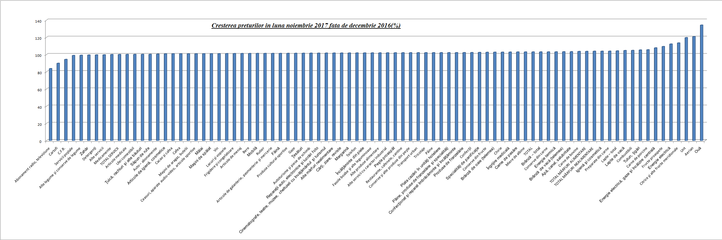 Preturile de consum in luna noiembrie 2017 comparativ cu luna noiembrie 2016 au crescut cu 3,2%, a anuntat marti Institutul National de Statistica. Cel mai mult s-au scumpit ouale, urmate de transportul aerian, unt, citrice si energia electrica, arata datele Statisticii. Aceasta inflamare a preturilor pune presiune atat pe Robor (care la 3 luni a stagnat marti la 2.15%), cat si asupra cursului de schimb leu/euro, daca tinem cont de faptul ca in tarile cu inflatie ridicata, asistam la o depreciere a monedei nationale in raport cu valutele partenerilor comerciali.