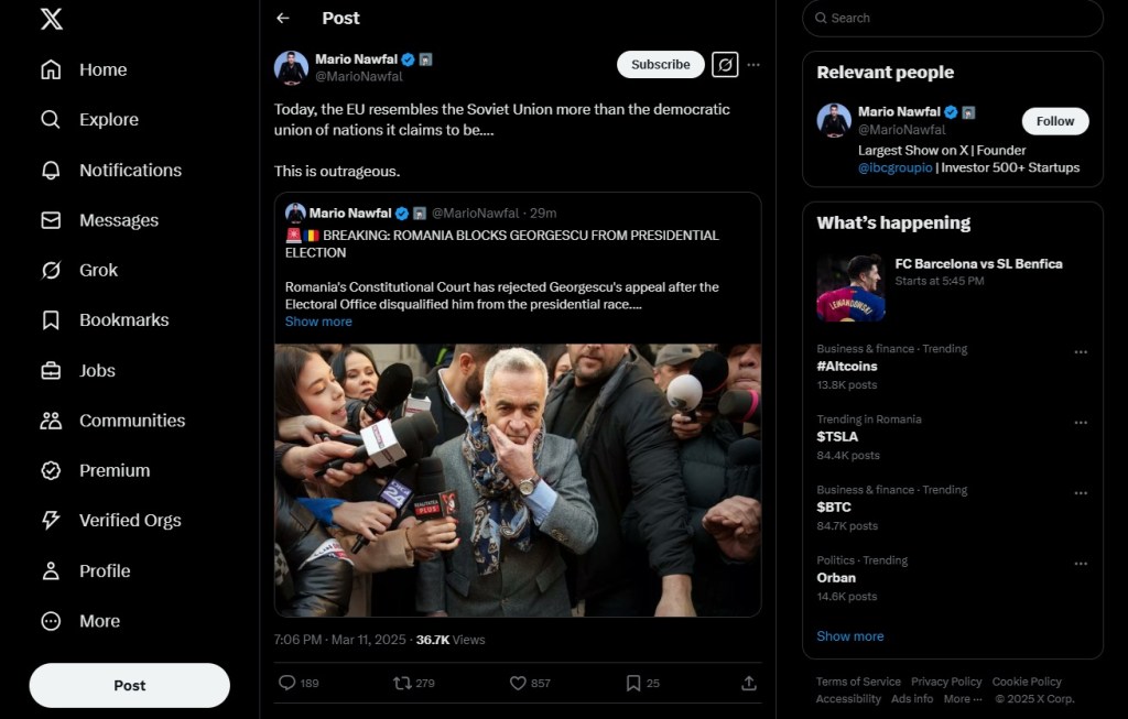 Newfal amintește în postarea de pe platforma X că primul tur al alegerilor prezidențiale din 2024 fusese câștigat de Călin Georgescu, menționând că anumiți critici spun că decizia CCR este un atac la adresa democrației.