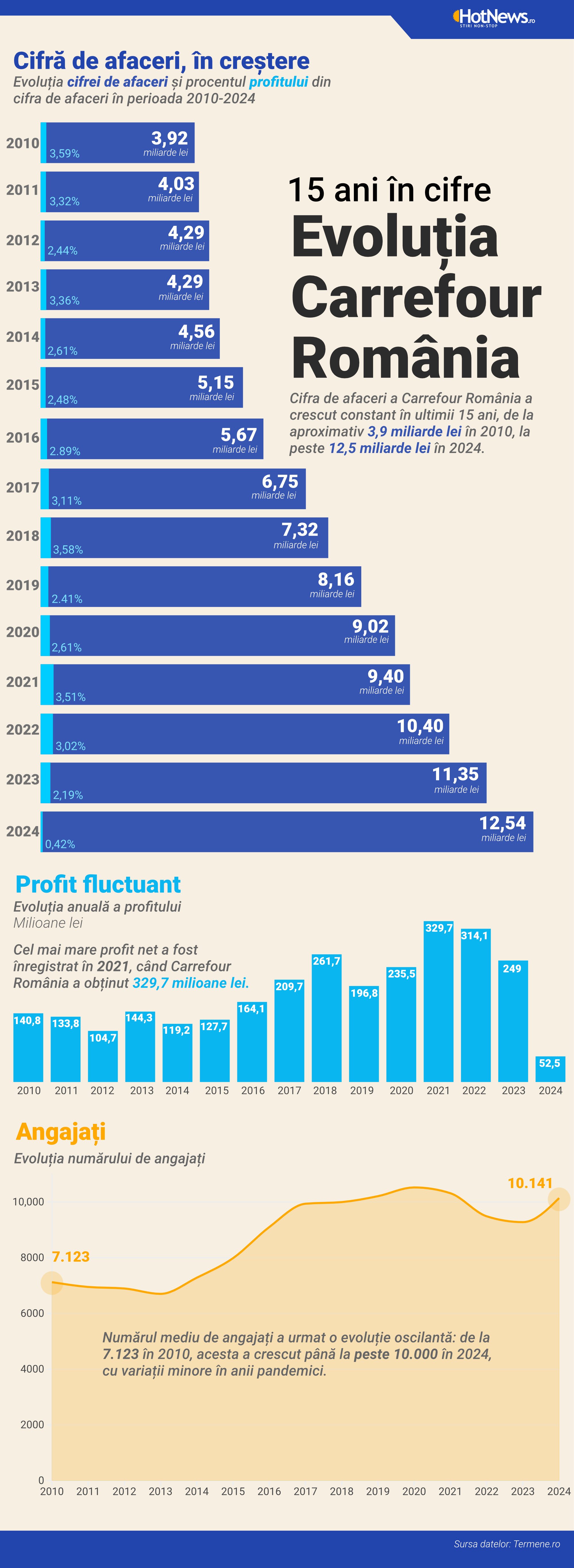 Între 2010 și 2024, cifra de afaceri netă a Carrefour Romania a crescut de la aproximativ 3,9 miliarde lei la 12,5 miliarde lei, reprezentând o creștere de peste trei ori.