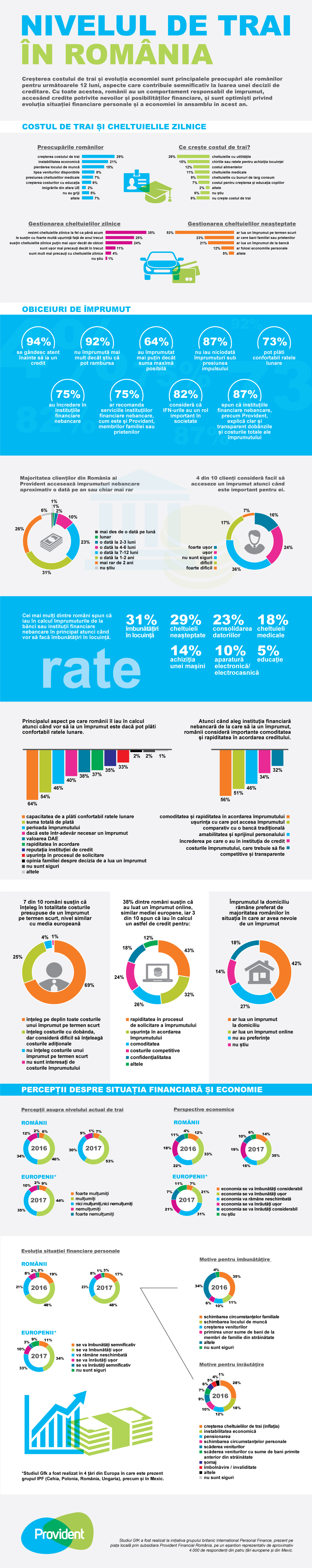 Romanii au un comportament de creditare responsabil, arata studiul GfK UK pentru compania-mama a Provident Financial Romania. Cei mai multi dintre respondentii din Romania spun ca iau in calcul imprumuturile de la banci sau institutii financiare nebancare in principal atunci cand vor sa faca imbunatatiri in locuinta (31%), cand intervin cheltuieli neasteptate care le pot influenta situatia financiara (29%) sau cheltuieli medicale (18%), cand cauta sa-si consolideze datoriile (23%), dar si pentru a investi in educatia copiilor (5%).