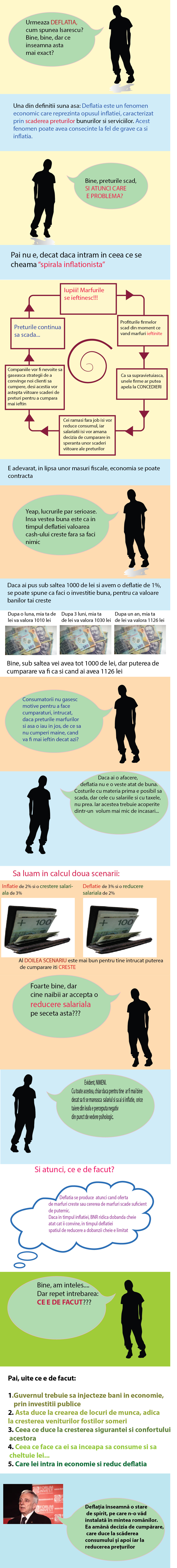 Pentru Guvernator, deflatia pare ca si transata. „Deflaţia înseamnă o stare de spirit, pe care n-o văd instalată în mintea românilor. Ea amână decizia de cumpărare, care duce la scăderea consumului şi apoi iar la reducerea preţurilor”, a conchis şeful BNR.