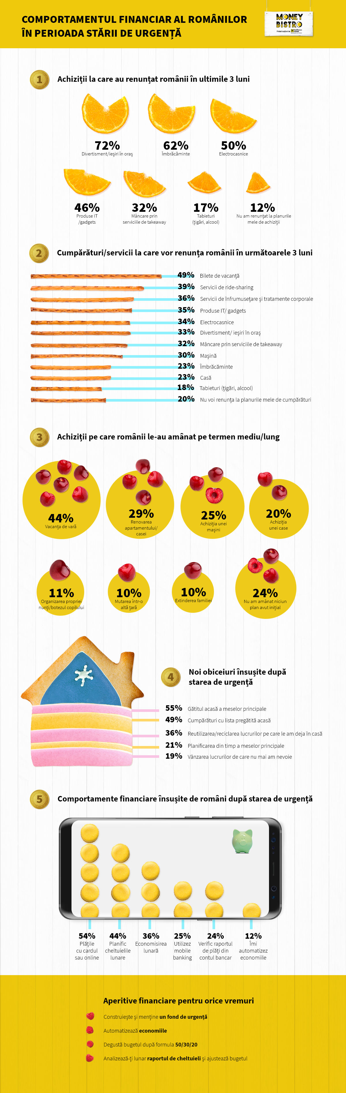 Totuși, în perioada stării de urgență, românii au strâns cureaua și au evitat cheltuielile pentru distracție (72%), îmbrăcăminte (62%), electrocasnice (50%) și produse IT sau gadgets (46%). Odată cu perioada de relaxare, pentru următoarele trei luni, doar 2 din 10 români spun că nu vor renunța la planurile de cumpărături. Restul de 80% declară că nu-și vor mai cheltui banii pe bilete de vacanță (49%), servicii de ride-sharing (39%), servicii de înfrumusețare și tratamente corporale (36%) sau pe produse IT/gadgets (36%).