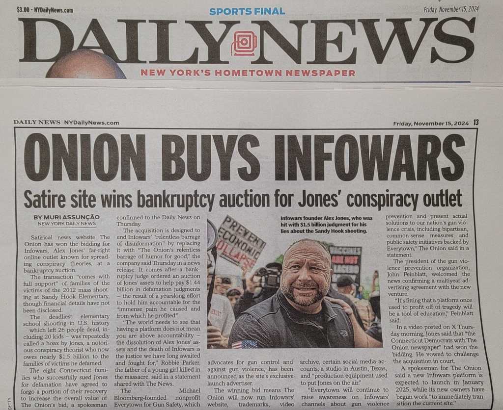 The Onion intenționa să relanseze Infowars în 2025 ca un site de satiră plin de „dezinformări vizibil mai puțin odioase” decât înainte.