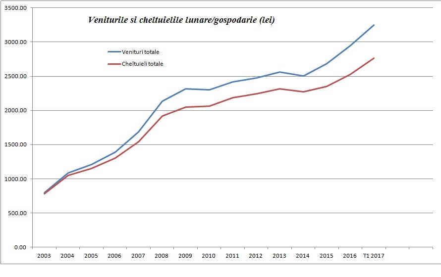 INS: In trimestrul I 2017, veniturile medii lunare /gospodărie au fost de 3250 lei, iar cheltuielile totale au fost, în medie de 2761 lei