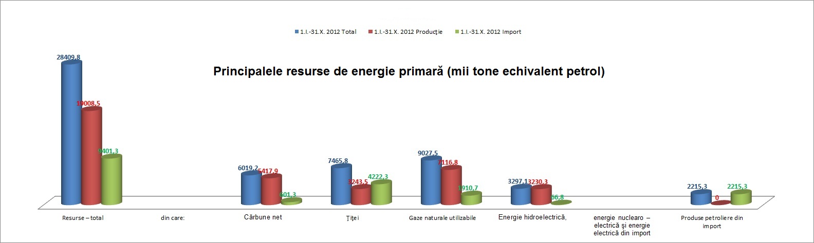 In perioada 1.I.-31.X.2012, resursele de energie primara au scazut cu 2,1%, iar cele de energie electrica au scazut fata de aceeasi perioada a anului precedent, cu 3,0%, arata Institutul National de Statistica intr-un comunicat difuzat vineri. Principalele resurse de energie primara in perioada 1.I.-31.X. 2012, au totalizat 28,409 milioane tone echivalent petrol (tep), in scadere cu 623,2 mii tep fata de primele 10 luni din 2011.
