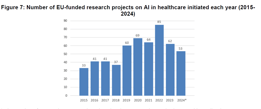 Potrivit datelor CE, între anii 2015 și 2024, au fost finanțate în UE 553 de proiecte de cercetare pe tema AI în domeniul sănătății, majoritatea dintre ele fiind derulate după anul 2019. Totodată, valoarea totală a acestora s-a ridicat la 3,53 de miliarde de euro, cu o medie de 6,73 milioane de euro pe proiect.