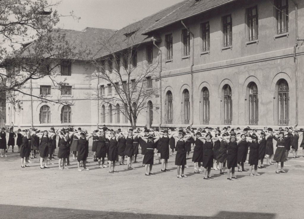 Eleve de liceu fac gimnastică în fața școlii. FOTO: Proiectul „Adolescent în comunism” / Arhiva