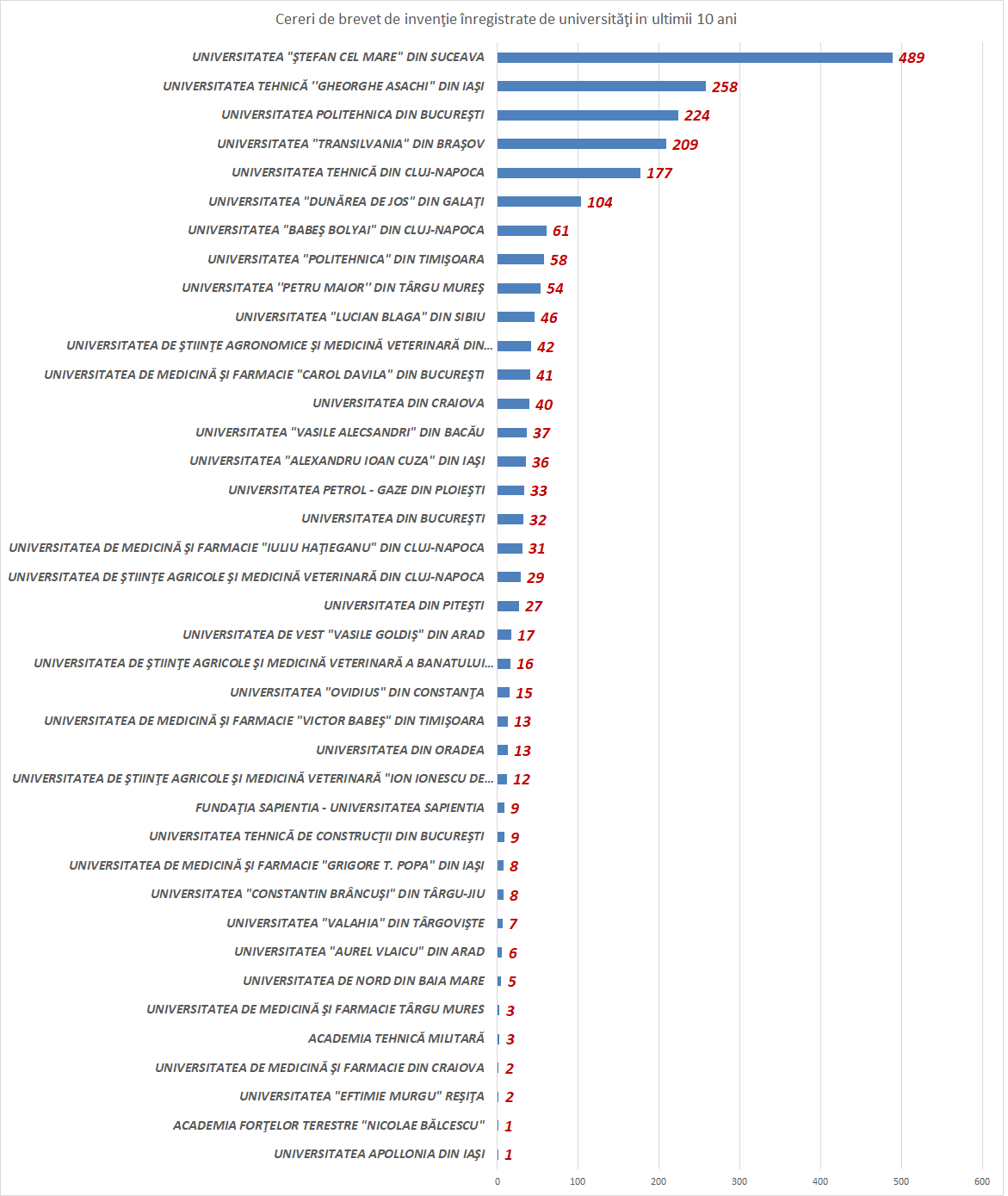 Cele mai multe cereri de brevet românești provin de la Universitatea Gheorghe Asachi din Iași, de la Universitatea din Craiova sau de la Universitatea Tehnică Cluj-Napoca. Restul sunt mici firme inovatoare, cu potențial uman și tehnic limitat și persoane fizice, adaugă experta.