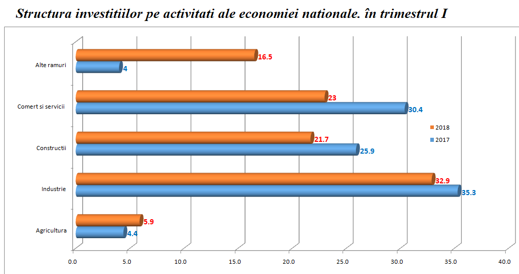 În trimestrul I 2018 investiţiile nete realizate în economia naţională au însumat 157,9 miliarde lei fiind în creștere cu 14,3%, comparativ cu trimestrul I 2017. Creșterea cea mai puternică a fost înregistrată la următoarele elemente de structură: alte cheltuieli (138,3%) și la utilaje (7,7%). Lucrările de construcţii noi au scăzut cu 3,8%.În categoria ”alte cheltuieli” intră cheltuieli pentru lucrări geologice şi de foraj, pentru cumpărarea animalelor de muncă, de producţie şi reproducţie, plantaţii de viţă de vie, pomi, împăduriri, cheltuieli pentru achiziţionarea mijloacelor fixe, cheltuieli pentru studiile de cercetare şi proiectare legate de obiectivele de investiţii şi pentru serviciile aferente transferului de proprietate.