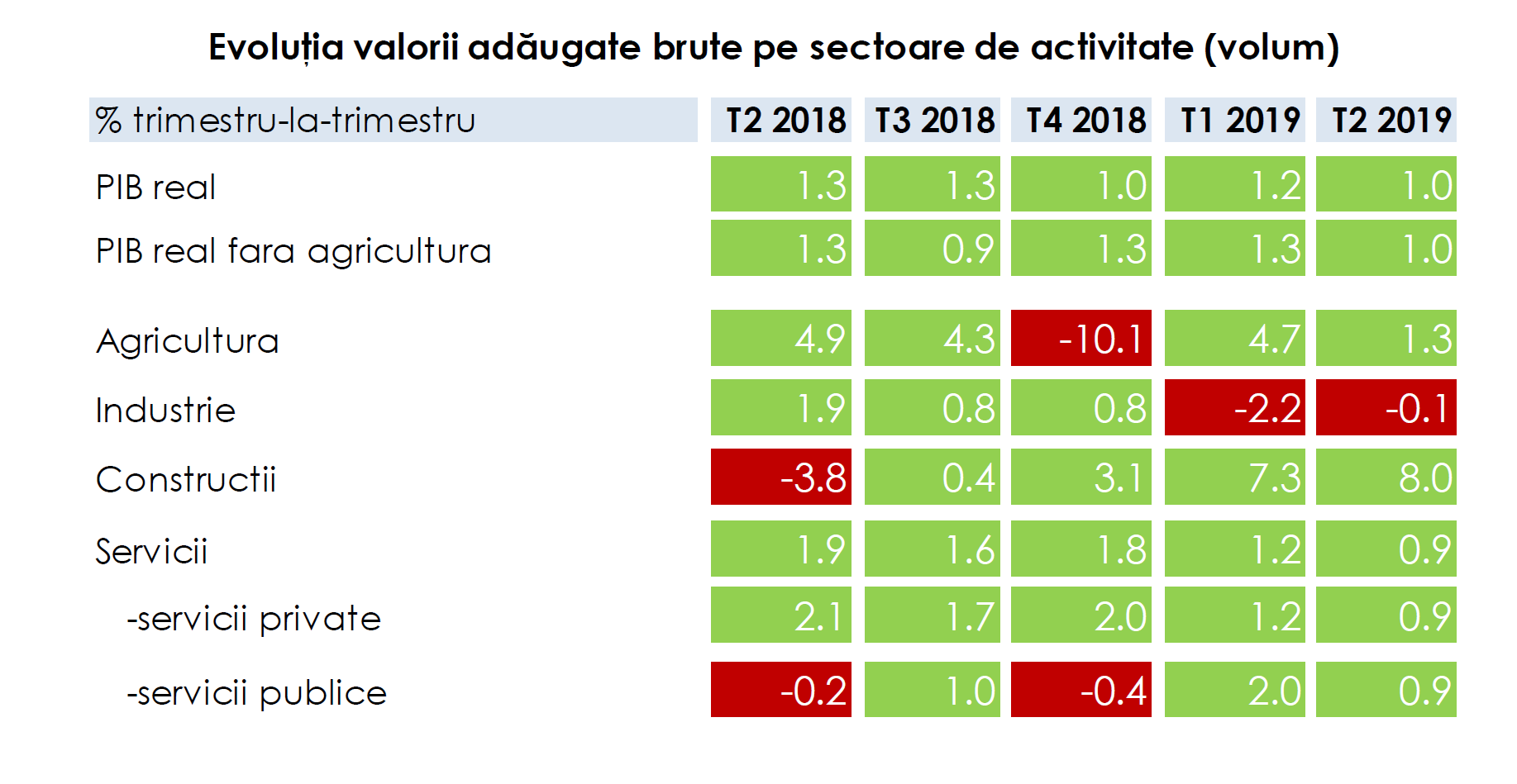 - Majoritatea sectoarelor de activitate au rămas pe un trend ascendent în T2. Construcţiile au înregistrat creşteri solide în ultimele trei trimestre (T4 2018-T2 2019).