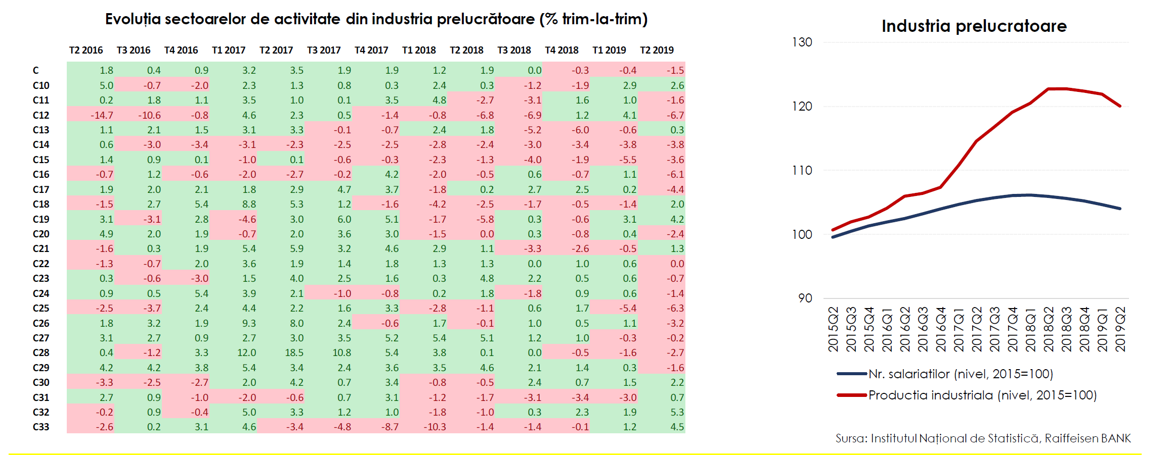 - Producţia industrială şi numărul salariaţilor în sectorul prelucrător – principala ramură industrială – s-au redus în ultimele trimestre.