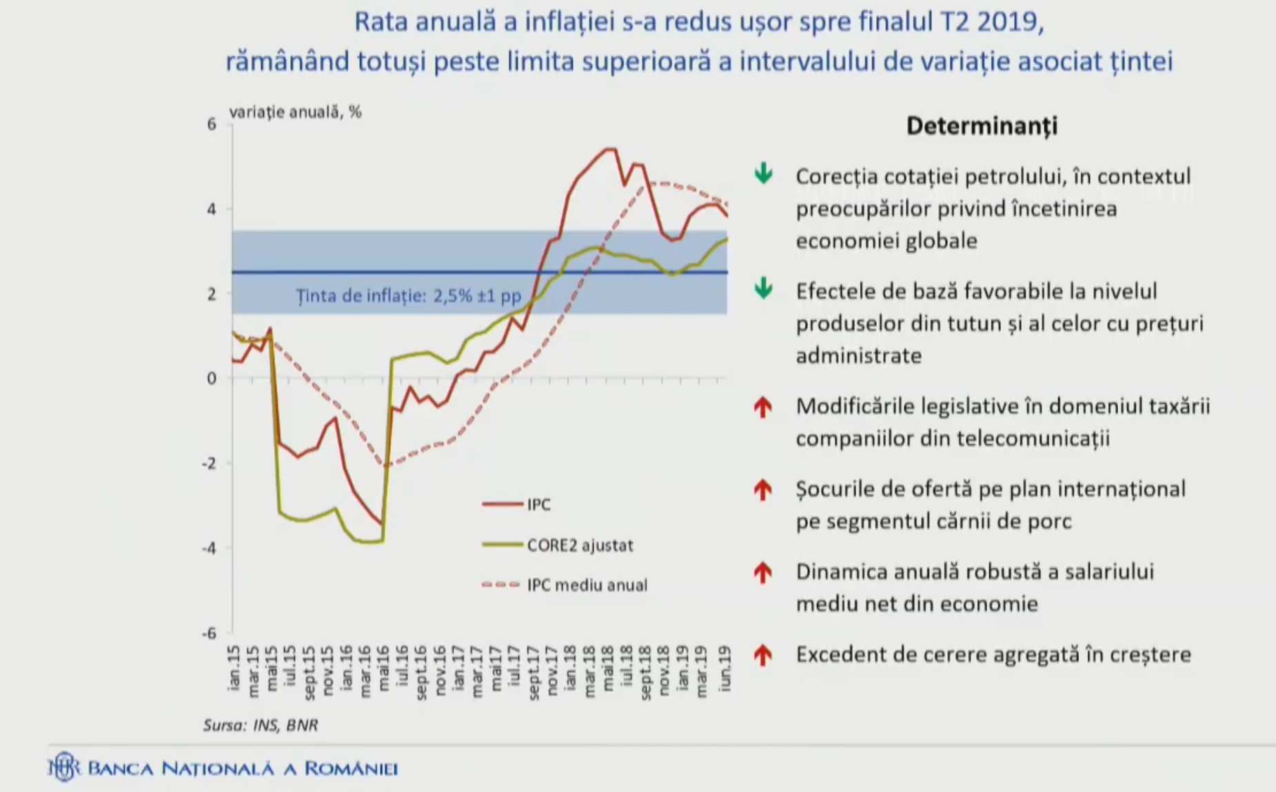 Banca Naţională a României (BNR) a majorat, la jumătatea lunii mai, la 4,2% prognoza de inflaţie pentru finalul acestui an şi estimează o inflaţie de 3,3% pentru 2020.