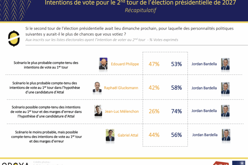 Noutatea oferită de acest sondaj ține de proiecțiile pentru al doilea tur de scrutin, unde Bardella pare a câștiga indiferent de scenariile testate.