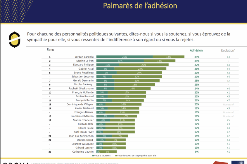 Sub cei doi se află centristul Édouard Philippe și liderul partidului prezidențial, Gabriel Attal, cu 32%, rspectiv 31% opinii favorabile.