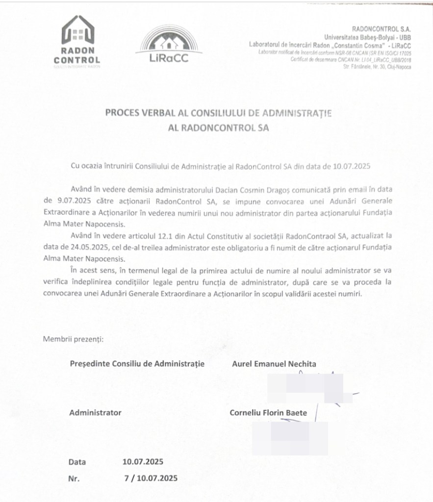 Un proces verbal al consiliului de administrație al Radoncontrol, intrat în posesia HotNews, confirmă că Dacian Cosmin Dragoș și-a dat demisia în data de 9 iulie 2025. În urma întâlnirii din 10 iulie 2025, CA-ul Radoncontrol a stabilit că cel de-al treilea administrator trebuie să fie numit, în mod obligatoriu, de către acționarul Fundația Alma Mater Napocensis.
