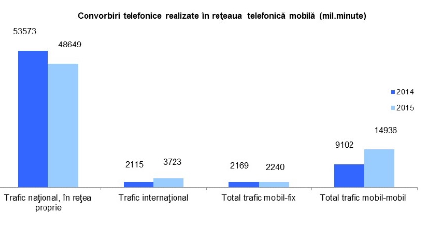 Convorbirile telefonice in reteaua telefonica mobila au inregistrat o crestere cu 3,9% in anul 2015 fata de anul 2014. Evolutia componentelor de trafic realizat in reteaua telefonica mobila fata de anul 2014 se prezinta conform graficului urmator: