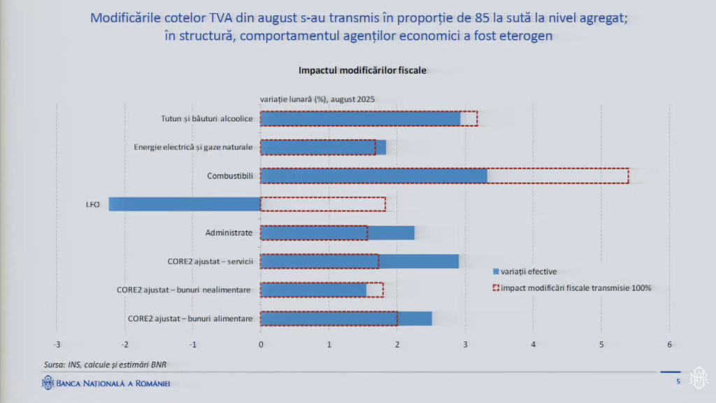 După calculele BNR, majorarea cotelor de TVA din august s-au transmis în general, în proporție de până la 85% în prețuri, cu diferențe între sectoarele economice.