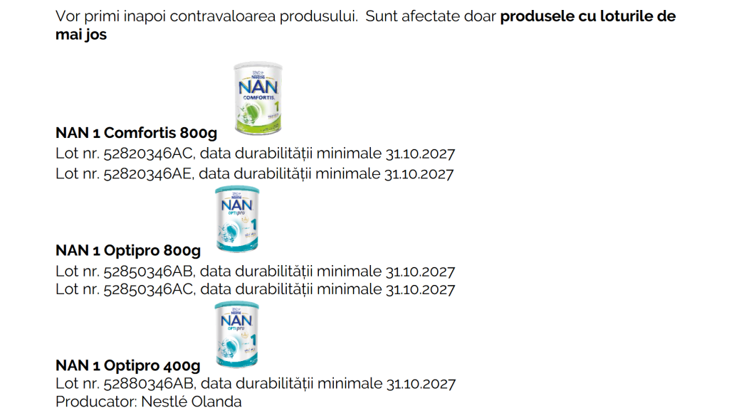 „Nestlé România iniţiază rechemarea voluntară pentru o cantitate limitată din produsele NAN 1 Optipro şi NAN 1 Comfortis, ca măsură de precauţie din cauza identificarii prezenţei Bacillus cereus pe una dintre liniile de producţie din fabrica de origine, linie pe care au fost produse loturile vizate. Siguranţa şi bunăstarea sugarilor este prioritatea noastră absolută. Menţionăm că nu au fost primite sesizari cu privire la efecte adverse asociate consumului produselor din loturile menţionate, rechemarea voluntară a acestora reprezentând o măsură de precauţie”, este anunţul postat pe site-ul ANSVSA.