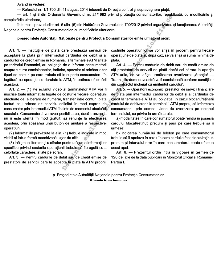 „Prestatorii de servicii care efectueaza operatiuni de plata prin intermediul cardurilor de debit si a cardurilor de credit la terminalele ATM au obligatia de a informa consumatorii asupra tuturor comisioanelor, taxelor si oricaror altor tipuri de costuri pe care trebuie sa le suporte consumatorul in legatura cu contractul de prestari servicii, conform prevederilor prezentului ordin”, se arata in lege.