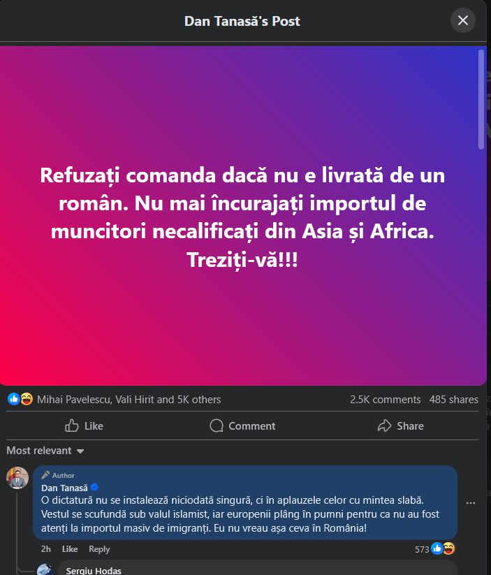 „Refuzați comanda dacă nu e livrată de un român. Nu mai încurajați importul de muncitori necalificați din Asia și Africa. Treziți-vă!”, a scris vicepreședintele AUR pe Facebook. Postarea sa a adunat în patru ore peste 2.000 de comentarii și un număr dublu de reacții.